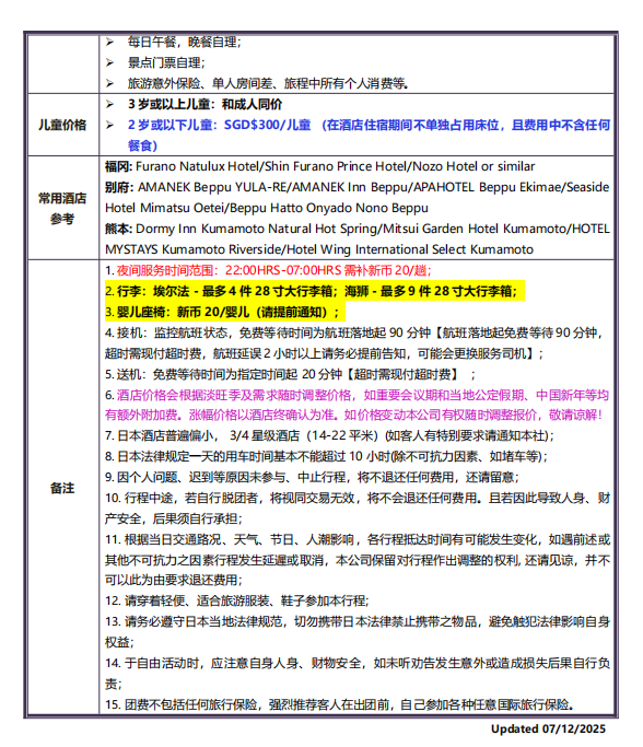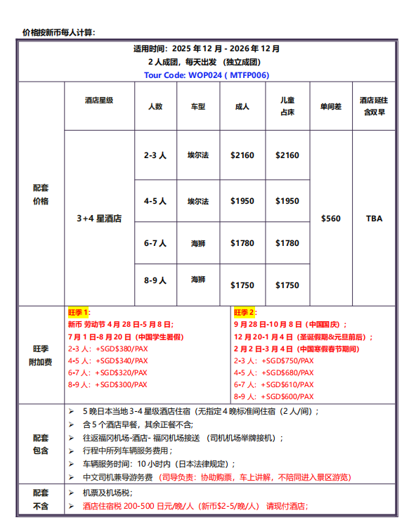 配套价格:SGD $1950/成人 (4-5人团)