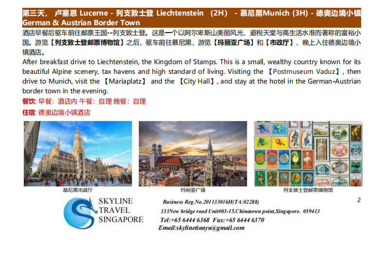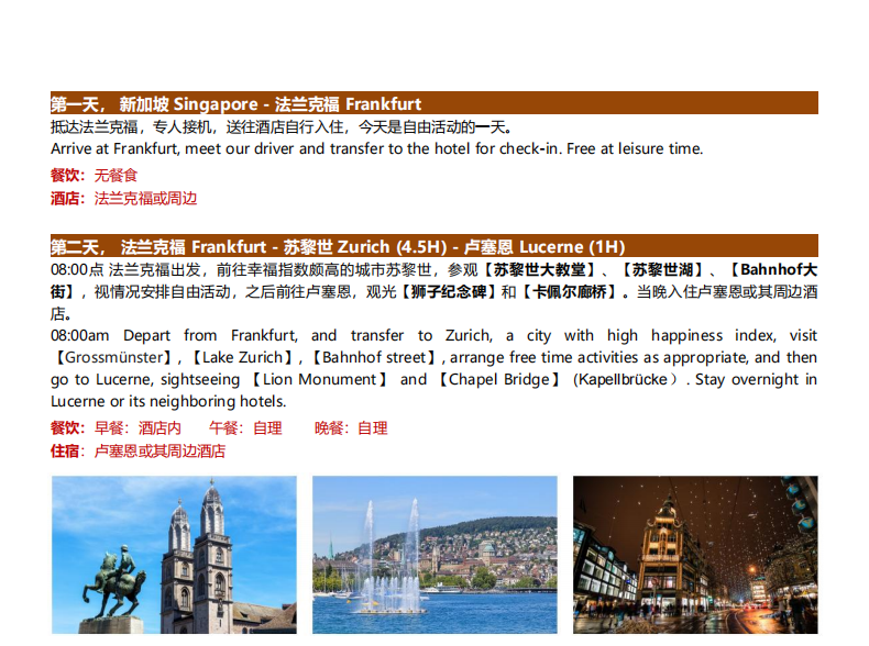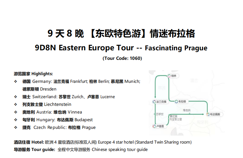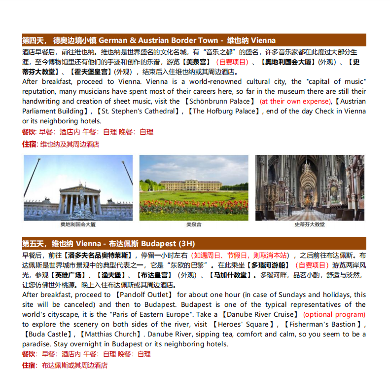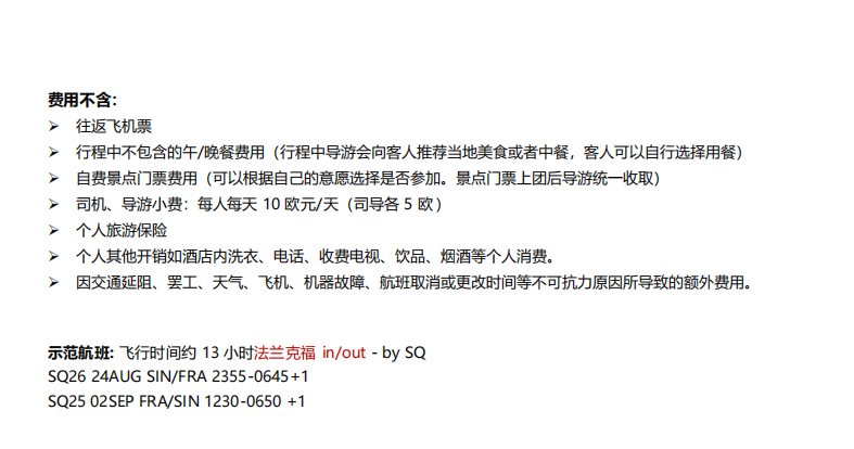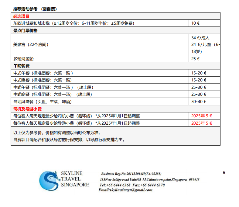 4. 司机、导游小费:每人每天4 欧元/天(司导各2 欧)(瑞士段-司导各3 欧)