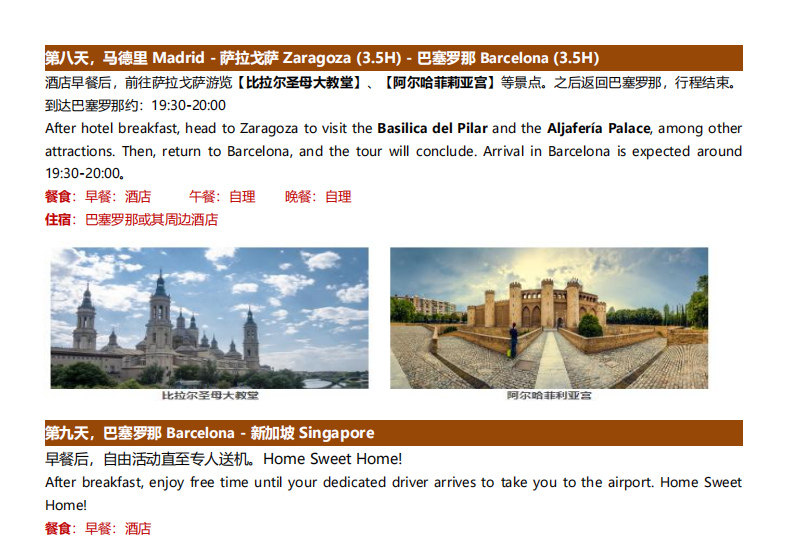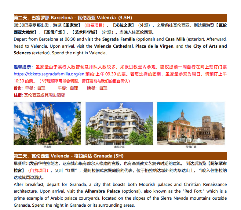 行程重点:巴塞罗那—瓦伦西亚—格拉纳达—马拉加—塞维利亚—里斯本—托莱多—马德里— 萨拉戈萨—巴塞罗那