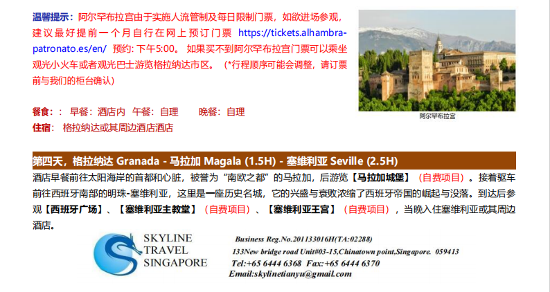 2)请注意:阿尔罕布拉宫由于实施人流管制及每日限制门票,如欲进场参观,建议最好在下单核对时间后自行在网上预订门票 https://tickets.alhambra-patronato.es/en/预约:下午17:00