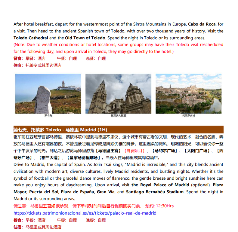 4)请注意:马德里王宫如欲参观,请下单核对时间后自行提前购买门票https://tickets.patrimonionacional.es/es/tickets/palacio-real-de-madrid 预约:12:30
