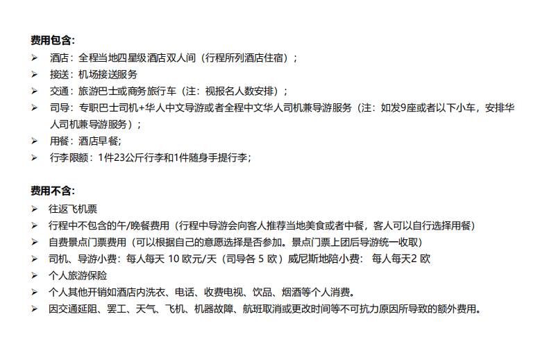 4. 司机、导游小费:每人每天4 欧元/天(司导各2 欧)