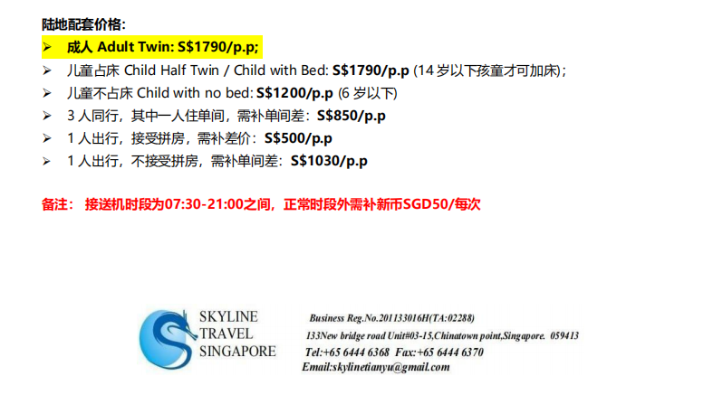 3人同行,其中一人住单间,需补单间差:S$650/p.p