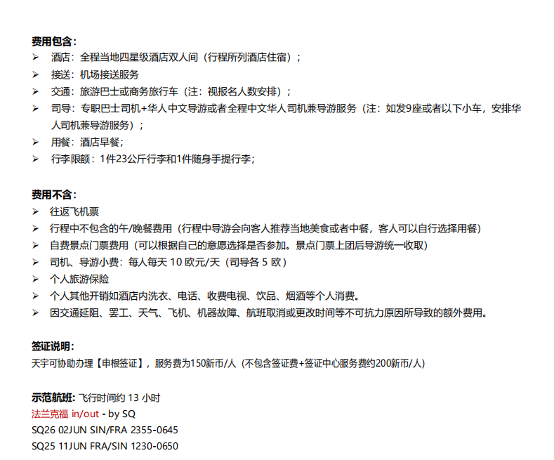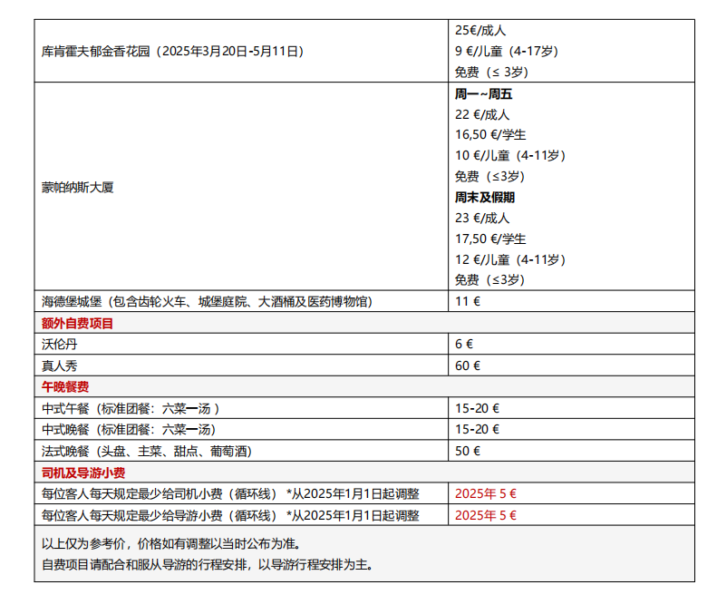 4.司机、导游小费:每人每天4 欧元/天(司导各2 欧)