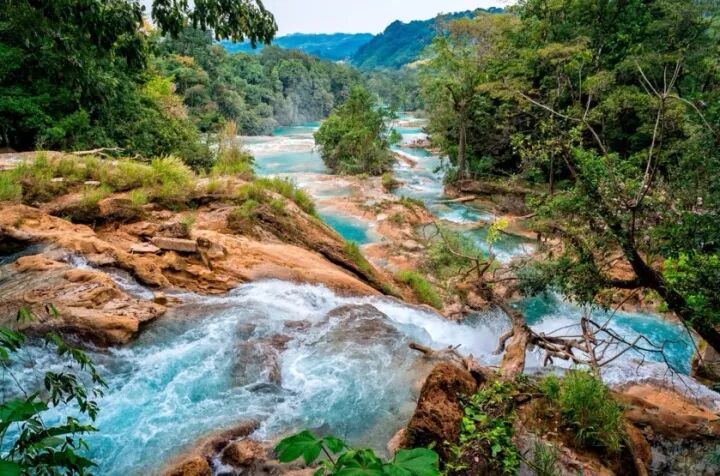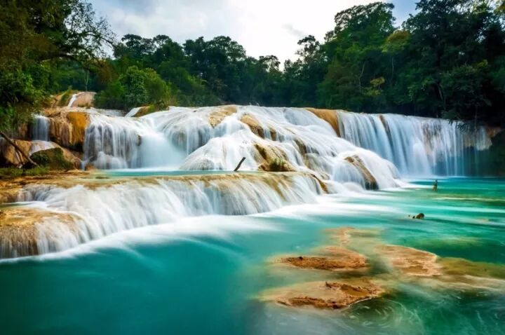 位于热带丛林中的蓝水瀑布(Agua Azul),由于水质富含矿物,因此呈粉蓝色,尤其是在山脚下的瀑布水潭在阳光的照射下,清澈晶莹,蓝得非常漂亮。