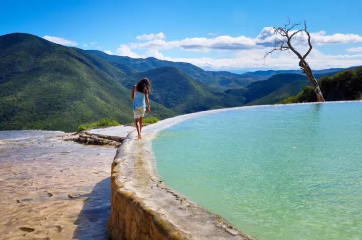 踏上滚水石白色的石灰沉淀面可以看到一个个天然形成的已经固化的小水洼,其中有一个比较的水池,成为了拥有无敌美景的悬崖泳池。