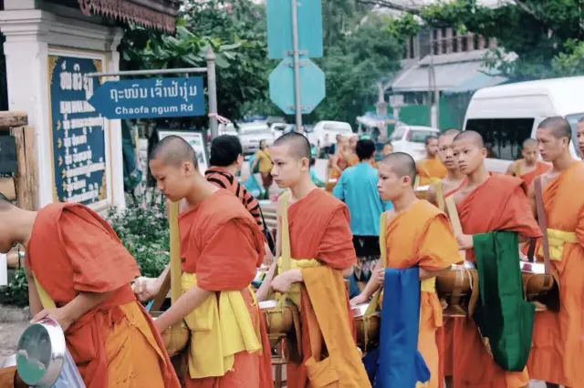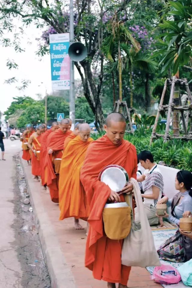 那一幅幅之前也曾在旅游杂志里面看见的橙色画面,老百姓们清晨跪在路边,等候着僧侣们,给他们分发食物,僧侣们虔诚接受着食物,维持着一天的生活。