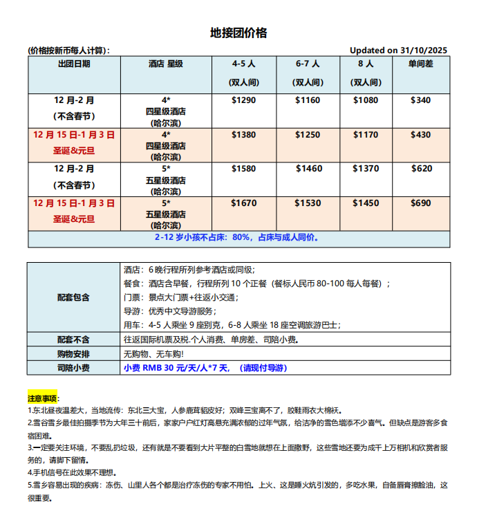 7天6晚 哈尔滨 亚布力 雪乡 冰雪通话之旅 配套详情 4人成行-私人小包团,每天出发 适用日期:2025年12月15日-2026年2月 (春节除外) 配套价格: 4人价格:SGD$1290/人起(双人间) 单房差:SGD$340/人(不含春节期间) 6人价格:SGD$1160/人起(双人间) 单房差:SGD$340/人(不含春节期间) 配套包含: - 酒店:6晚行程所列参考酒店或同级; - 餐食:酒店含早餐,行程所列10正餐; - 门票::景点大门票+往返小交通; - 导游:优秀中文导游服务; - 用车:4-5人乘坐9座别克,6-8人乘坐18座空调旅游巴士; - 司陪小费:小费RMB30元/天/人*7 天,(请现付导游) - 无购物、司机会在车上推荐当地特产或纪念品(车购品种待告知)。 配套不含: - 往返国际机票及税 - 个人旅游保险及其它个人消费,单房差、司陪小费等 备注: - 2-12岁小孩不占床:80%,占床与成人同价。 - 如遇国家或地方政府政策性涨价,差价需由旅客承担。 - 不含春节期间 **具体价格详情,酒店房型选择,还请与我们联系