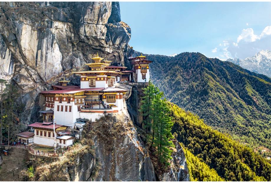 虎穴寺地势险要,位于帕罗峡谷900 米高的悬崖峭壁上,景色雄伟壮观。