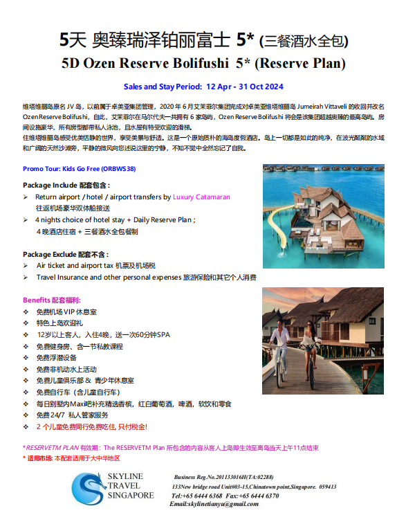 5天4晚 马尔代夫奥臻瑞泽铂丽富士