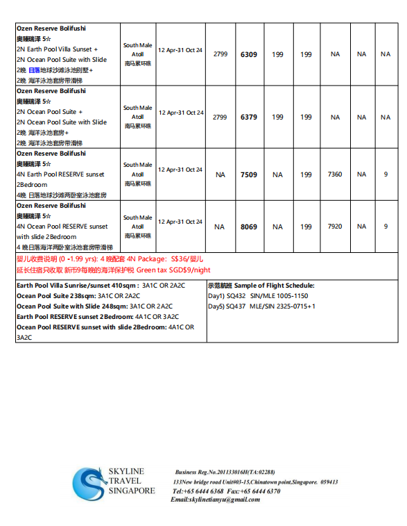 12岁以下儿童特别福利:5天配套只需SGD$199/儿童