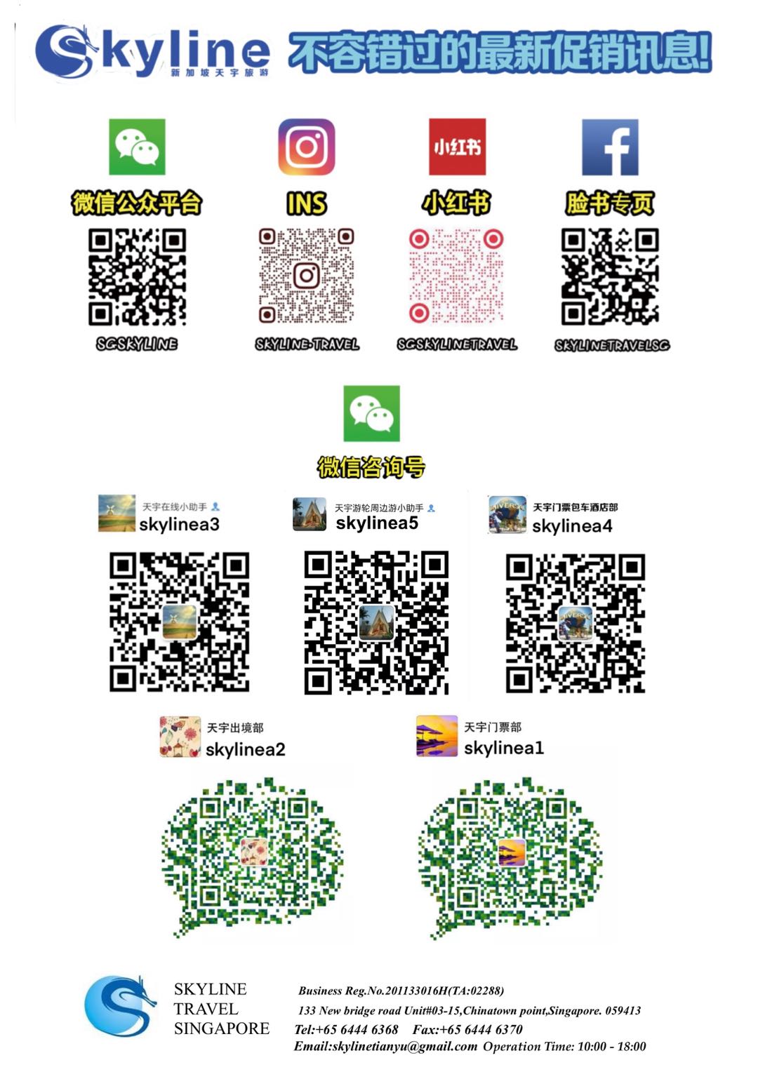 在线预订:拨打电话 +65 6444 6368/6444 6369,或是采用以下任何一种联系方式由客服帮助您完成信息的确认和下单操作。
