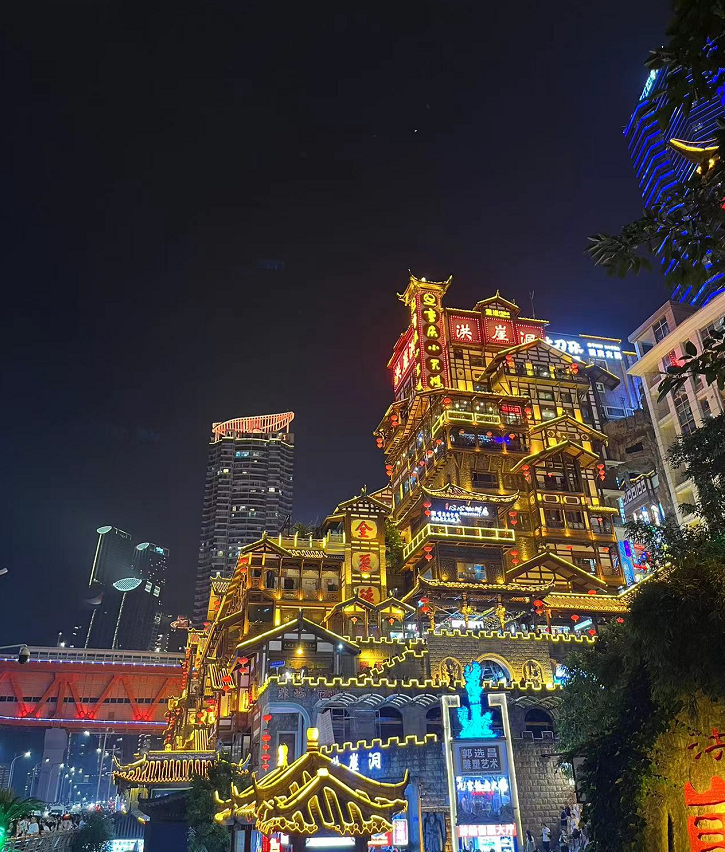【洪崖洞夜景】位于重庆市核心商圈解放碑沧白路、长江、嘉陵江两江交汇的滨江地带,坐拥城市旅游景观、商务休闲景观和城市人 文景观于一体。以具巴渝传统建筑特色的"吊脚楼"风貌为主体,依山就势,沿江而建。