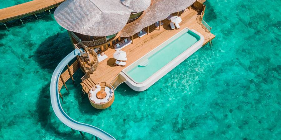 Soneva Jani 度假村位于诺鲁环礁岛(Noonu Atoll)的 Medhufaru 岛上,拥有一片长 5.6 公里的泻湖,提供水上别墅和岛屿别墅。每间水上别墅均可通往蜿蜒的私人泻湖,设有私人游泳池和让客人可以在主卧室内观赏星星的可伸缩屋顶。部分别墅设有直接从屋顶连接到泻湖下方的滑梯。