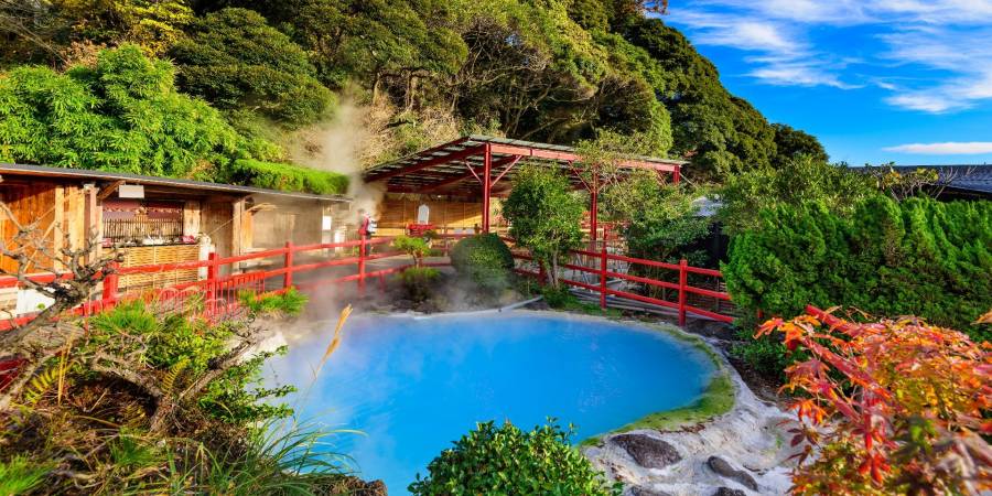 ▼别府海地狱:“别府地狱八景”中最具代表性的景点之一,以鲜艳的钴蓝色热泉池闻名。因池水温度高达约98°C、蒸汽腾腾,看似美丽却无法入浴,因此被称为“地狱”。