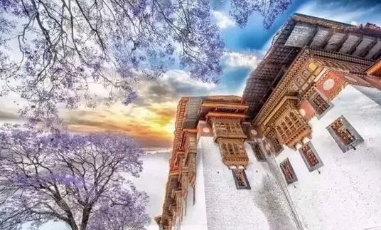 春天的不丹,得到上帝的眷顾,上帝把一整片浪漫的紫色,都洒在这片神圣的土地上。蓝楹花枝叶繁茂,满树紫蓝色的花朵,花影婆娑,曼妙多姿。普纳卡宗变得更加梦幻。紫花,白墙,红衣佛僧,令人心境安然,进入禅意佛境。